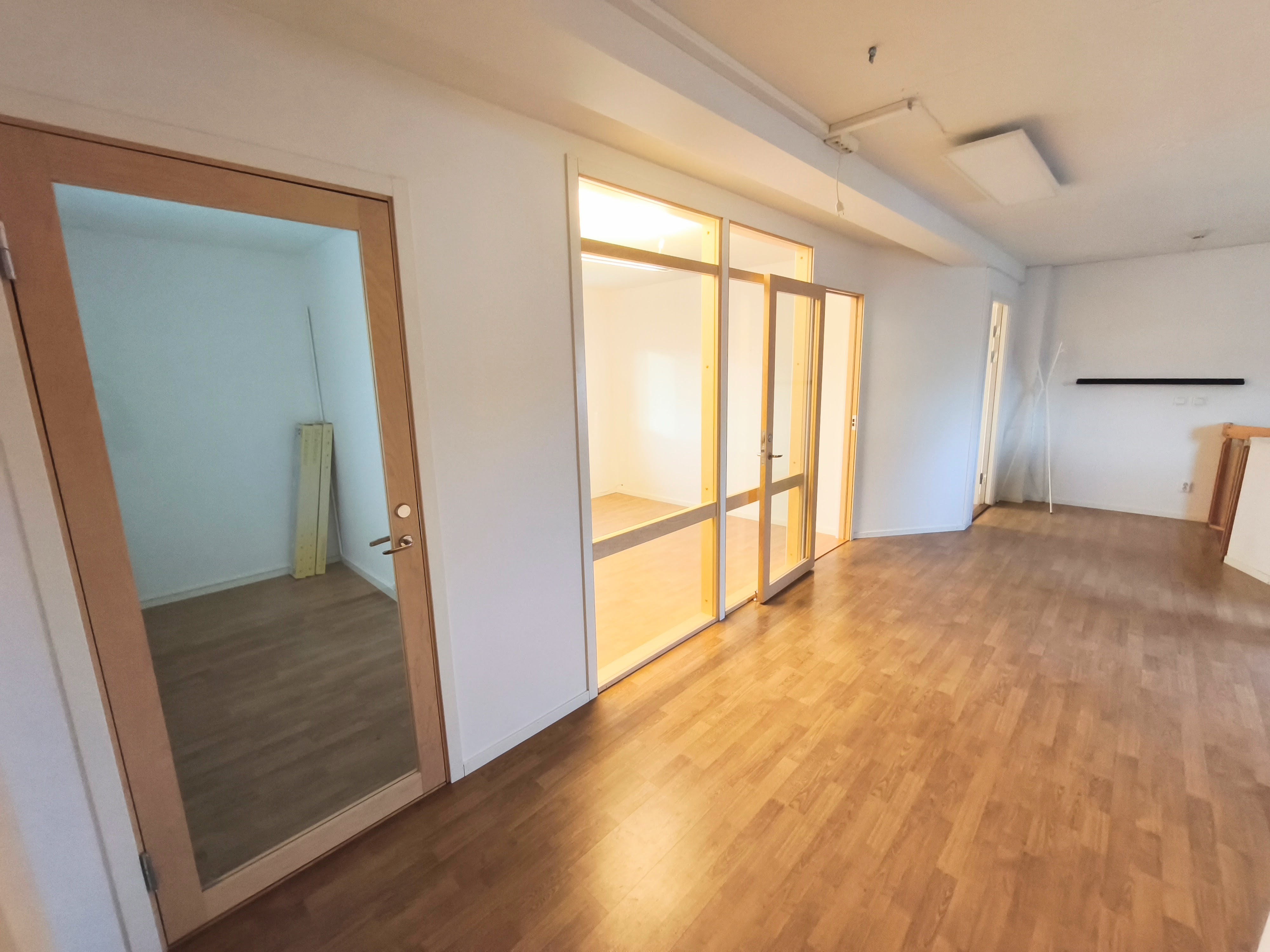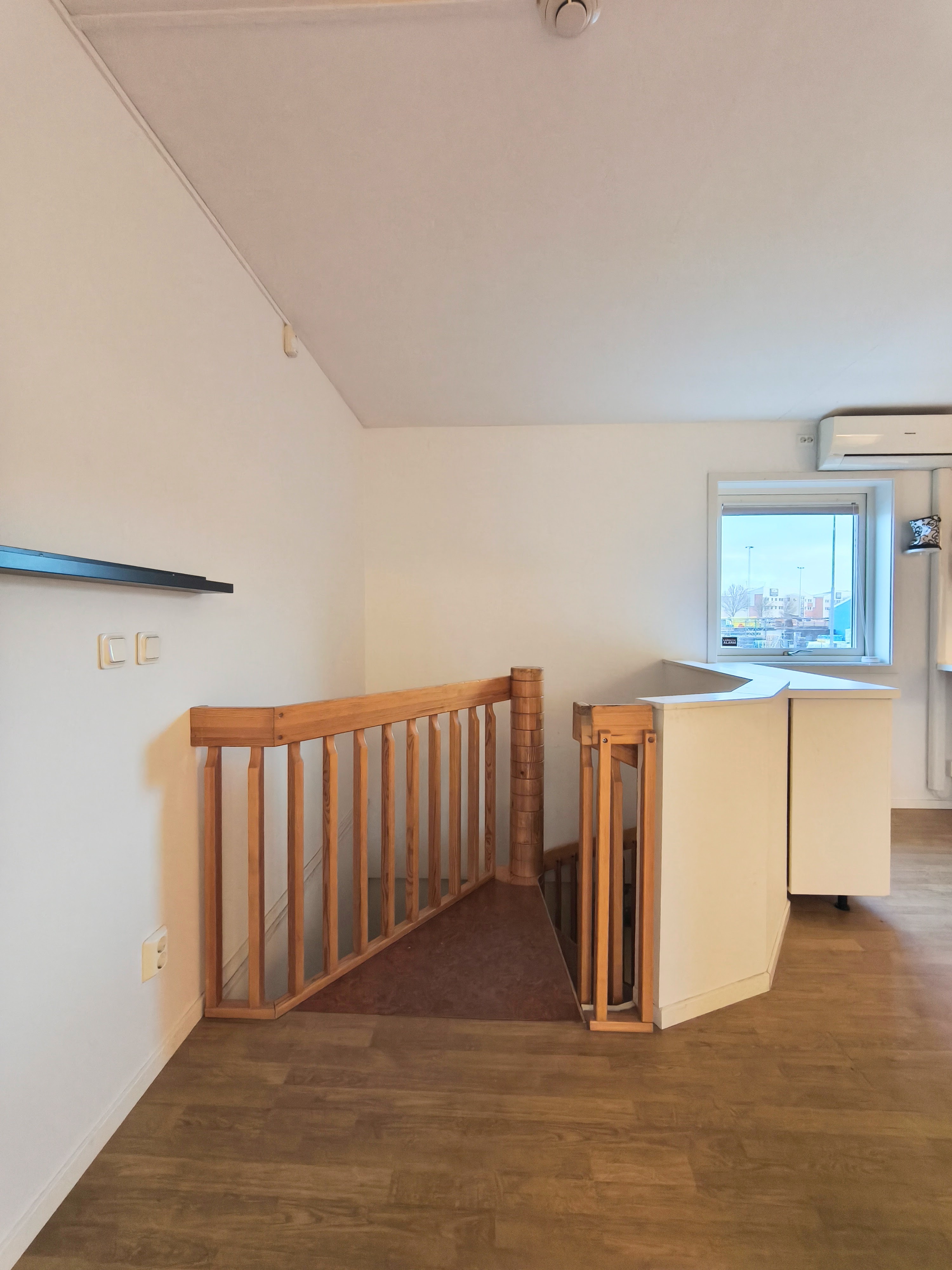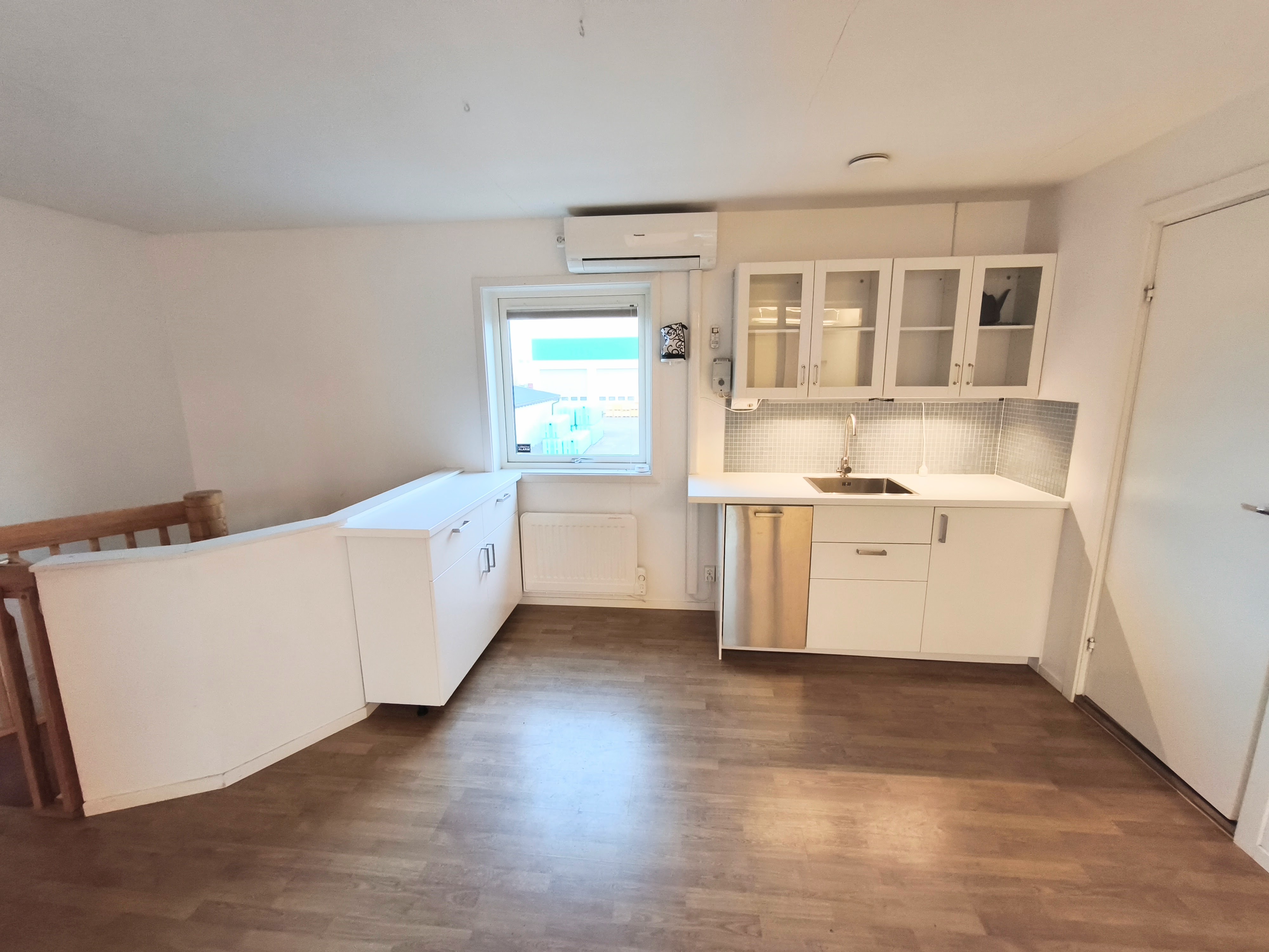 Fint ytskikt på övre plan för kontor, kök och WC som nås genom spiraltrappa.